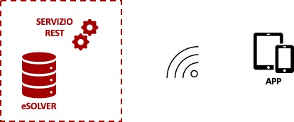 Il servizio REST viene eseguito da un server web (Microsoft IIS); può essere installato sullo stesso server in cui si trova il prodotto gestionale, oppure su un server dedicato. La app viene installata sui dispositivi portatili e comunica esclusivamente con il servizio REST (nella maggior parte dei casi tramite Wi-Fi); la app non può accedere direttamente al database o alla direttiva base del prodotto gestionale.