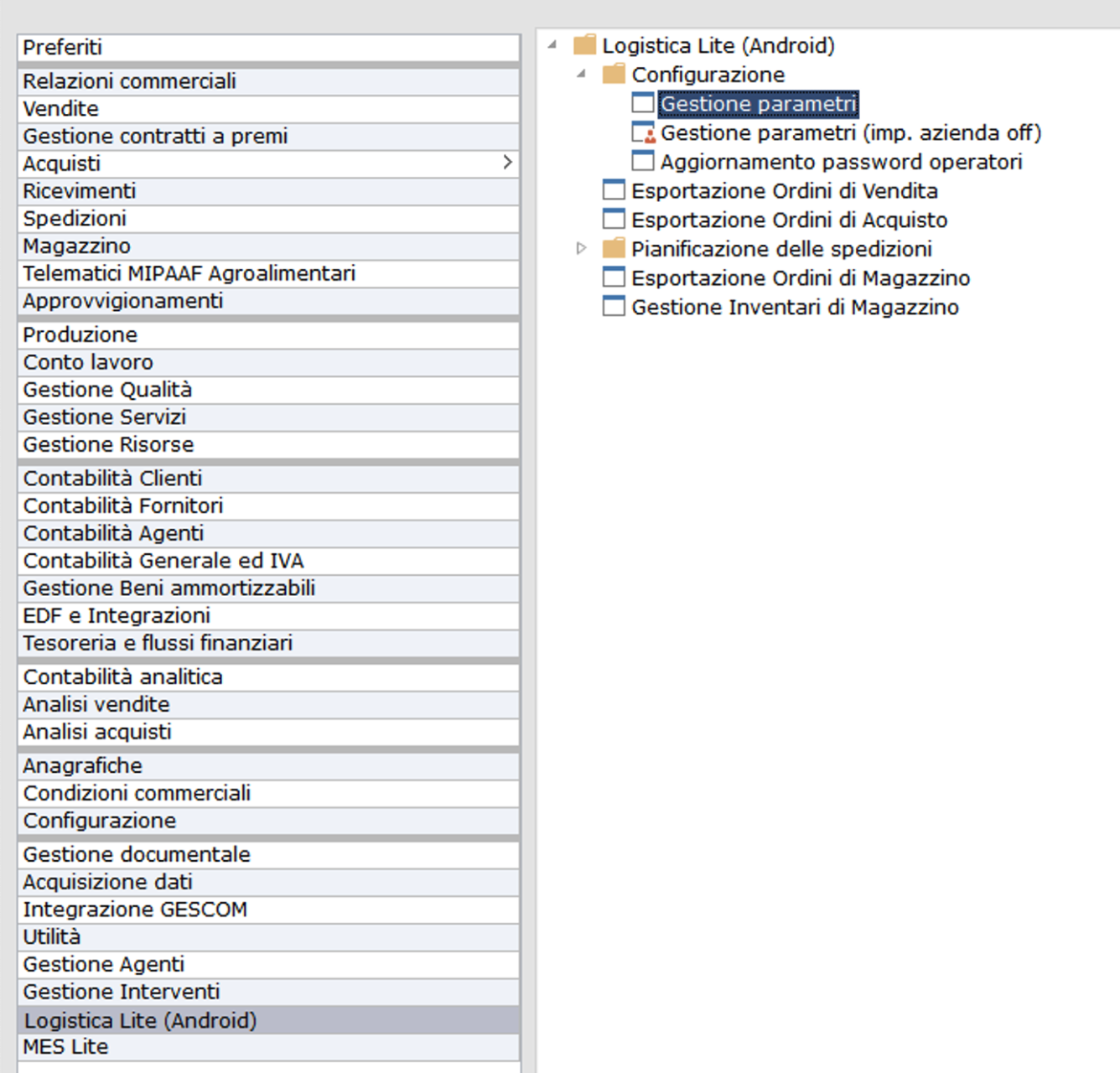 - avviare la voce di menù Logistica Lite (Android)/Configurazione/Gestione parametri