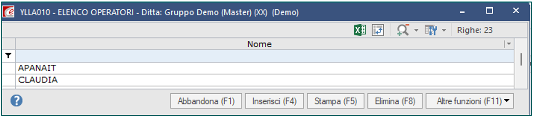 Nella griglia di gestione è possibile definire il gruppo e il tipo documento da abilitare: