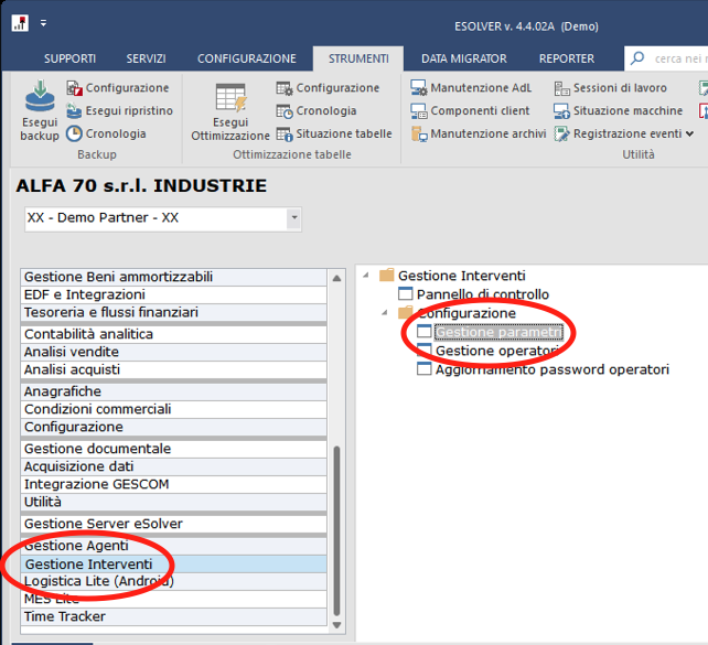 Questo paragrafo descrive alcune impostazioni di base da effettuare con la funzione Gestione parametri di Gestione Interventi. Per completare questa attività è necessario avviare il programma Gestione parametri dal menu Gestione Interventi/Configurazione.