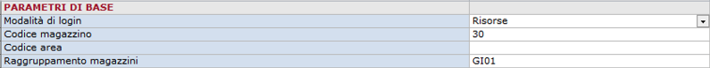 - Codice magazzino. È necessario indicare uno dei codici magazzino associati al raggruppamento "GI01". Se il magazzino è gestito ad aree di tipo collocazione, si consiglia di compilare anche il parametro Codice area