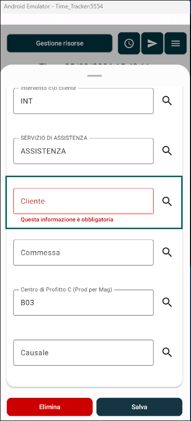 | Cliente obbligatorio | Prestazioni | Abilita / Disabilita | Se il parametro è attivo non è possibile salvare una registrazione senza indicare il cliente a cui è collegata: |