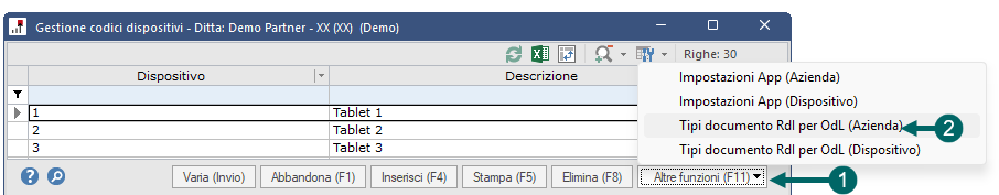 Per procedere con la prima opzione è necessario selezionare la funzione ”Altre funzioni“ e “Tipi documento Rdl per OdL (Azienda)”