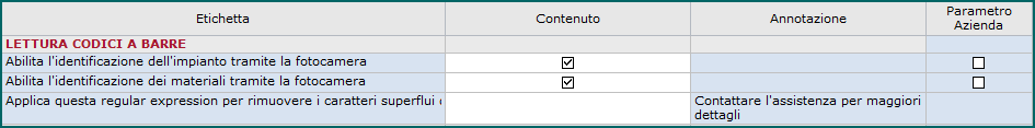 Abilita l'identificazione dei materiali tramite la fotocamera | Abilita \ Disabilita | Se il parametro è attivo è possibile inserire un materiale in un consuntivo di lavoro tramiti la lettura del barcode relativo |