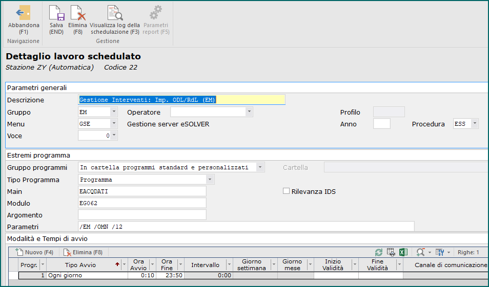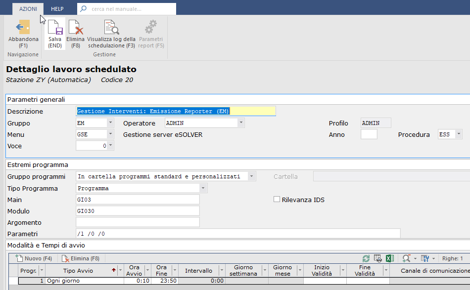 Posizionarsi in eSOLVER nel menù CONFIGURAZIONE e selezionare la voce Gestione schedulazioni/Schedulazione lavori