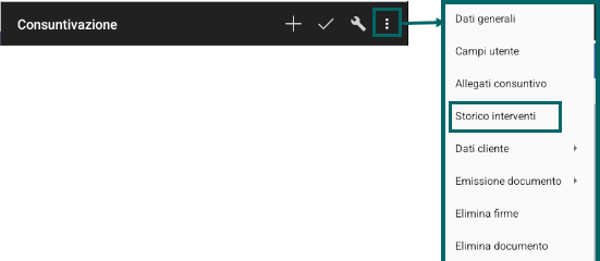 Per consultare lo storico degli interventi per cliente è necessario posizionarsi sulla pagina consuntivazione di un intervento dove tramite l'apposito menù si accede all'elenco degli interventi inseriti in eSolver per il singolo cliente: