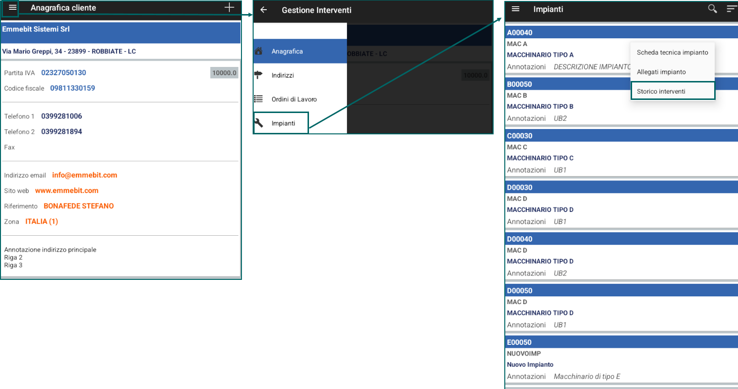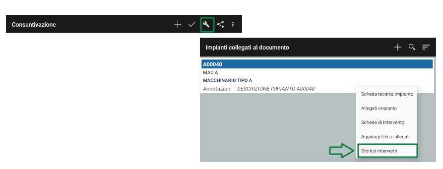 - accedendo al menù disponibile nell'anagrafica di un cliente è possibile accedere all'elenco di suoi impianti; selezionando il singolo impianto è possibile visualizzare lo storico degli interventi registrati: