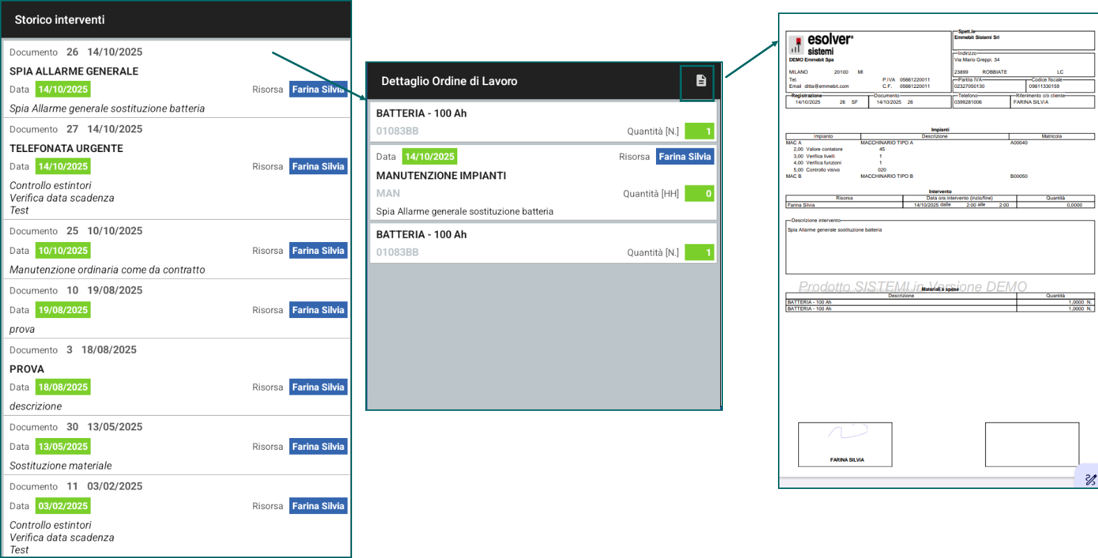 Selezionando la voce di menù l'app visualizza l'elenco dei consuntivi inseriti in eSolver; per ogni documento è possibile accedere al suo contenuto e, nel caso di archiviazione documentale attivata, al pdf del rapportino inviato al cliente: